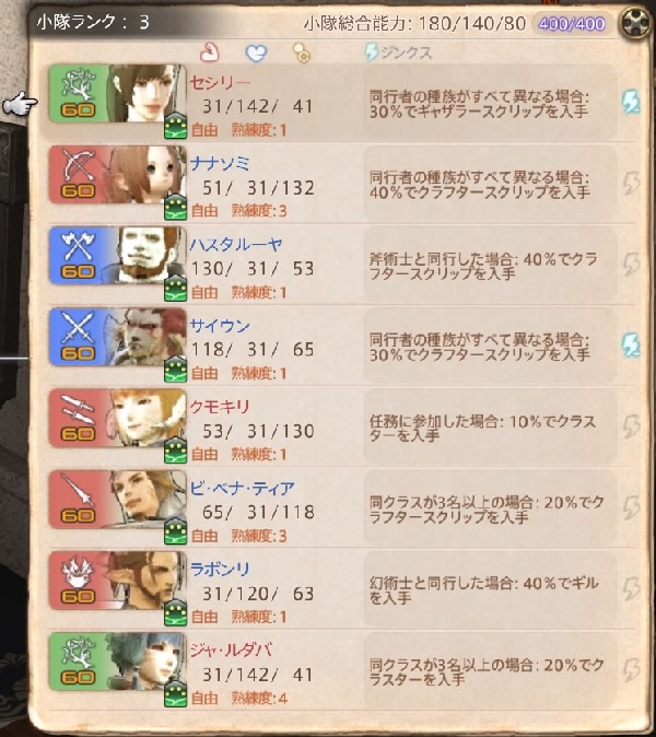 ・冒険者小隊:ジンクスの効果 0156 ジンクスには能力の上昇や獲得経験値の上昇など様々な効果があり、ランク2から行える通常任務以上の任務を成功すると発生することがあります。冒険者小隊のジンクス発動条件の表記について 種族編成は上から ルガディン ミコッテ ルガディン エレゼン です。 「自分と異なる種族と同行」 という条件を満たしているにも関わらずジンクスが発動しません。ランダムボーナスが有効な小隊任務ではジンクスの効果が常に発動し、能力上昇の効果では上昇効果も強化されたりします。 冒険者小隊のq&a ①中尉昇級の条件は? レベル40の重要任務を成功すると中尉になります。 ②クラスの変更にデメリットはある?